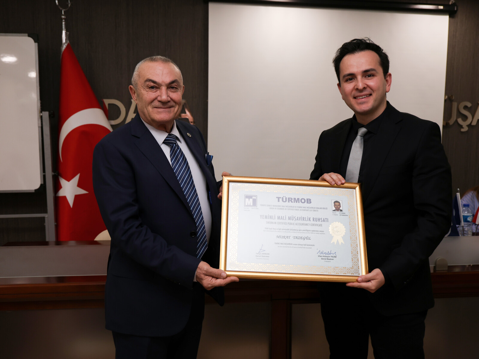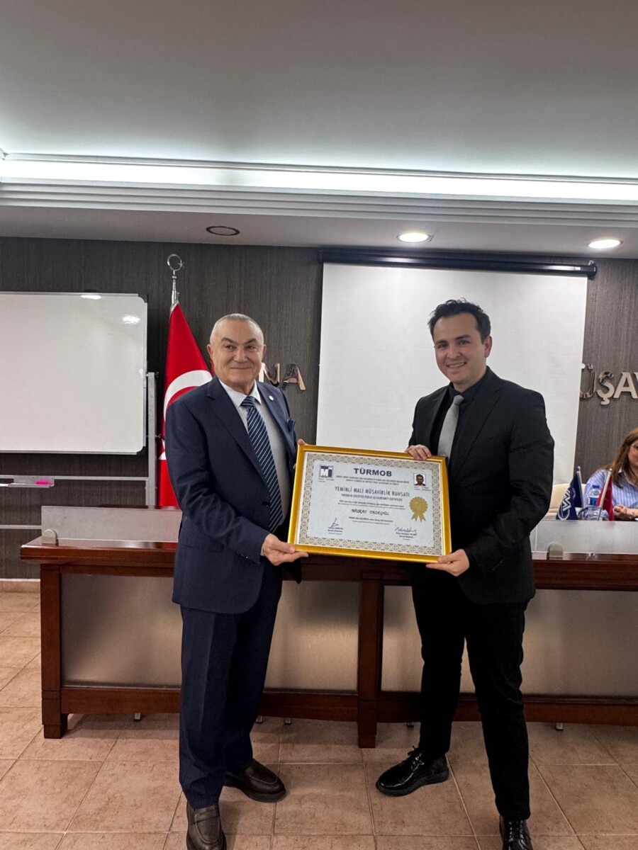 Yeminli Mali Müşavirlik ruhsatı almaya hak kazanan Vergi Müfettişi Murat TAZEGÜL’ E Oda Başkanımız Sn. Yılmaz UÇAK ve Yönetim Kurulu Üyelerimiz ruhsatını takdim etmiştir.